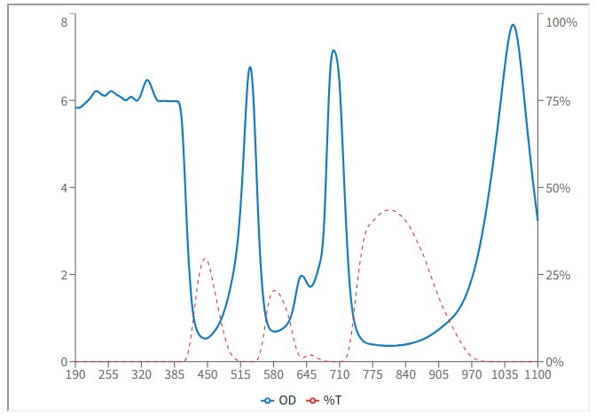 OD(Optical Density):為對雷射的阻擋力,數值越大對雷射阻擋的能力越高,在可見光雷射的應用時,須考慮對光時仍要保持看得到雷射光點而又不刺眼的狀態,因此要選擇適當的OD值,以免阻擋過大而看不到雷射光點無法對光,OD值對應穿透率與阻擋值可參考以下表格: