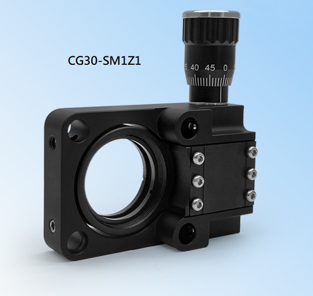 搭配分厘卡頭,沿著光軸精密調整光學元件的位置; 槓桿設計,最小位移量為 2 um; SM1(1.035"-40)螺紋,可安裝最厚為6mm的Ø1吋(25.4 mm)光學元件,或是用轉接環安裝物鏡; 兩種分厘卡頭配置方式,利於架設不同光學系統。 型號 位移量 CG30-SM1Z1 2 mm CG30-SM1Z2 1.5 mm