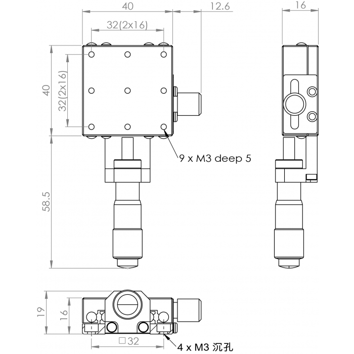 材質:SUS440C不鏽鋼,表面鍍無電解鎳 檯面尺寸:40 x 40 mm 厚度:15 mm 行程:13 mm 驅動方式:分厘卡頭 讀取精度:0.01mm 荷重:10 kgf 重量:0.23 kg 型號: STS40AC 分厘卡頭位在中心 STS40AL 分厘卡頭位在左側 STS40AR 分厘卡頭位在右側