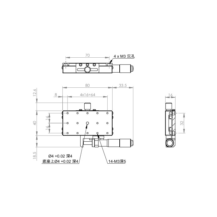 長方形設計,增加移動行程 材質:SUS440C不鏽鋼,表面鍍無電解鎳 檯面尺寸:40 x 80 mm 厚度:16 mm 行程:25 mm 驅動方式:分厘卡頭 讀取精度:0.01mm 荷重:10 kgf 重量:0.4 kg 型號: STS4080AL 分厘卡頭位在左側 STS4080AR 分厘卡頭位在右側