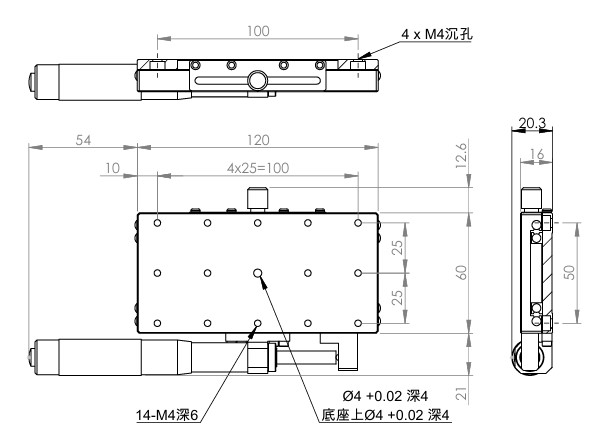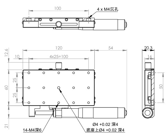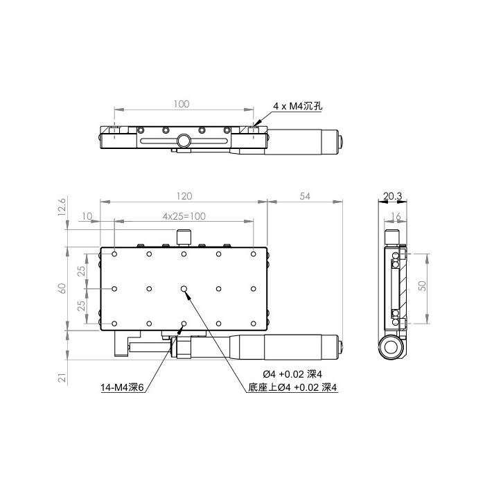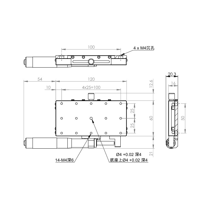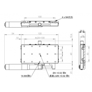 長方形設計,增加移動行程 材質:SUS440C不鏽鋼,表面鍍無電解鎳 檯面尺寸:60 x 120 mm 厚度:20 mm 行程:50 mm 驅動方式:分厘卡頭 讀取精度:0.01mm 荷重:20 kgf 重量:0.85 kg 型號: STS60120AL 分厘卡頭位在左側 STS60120AR 分厘卡頭位在右側