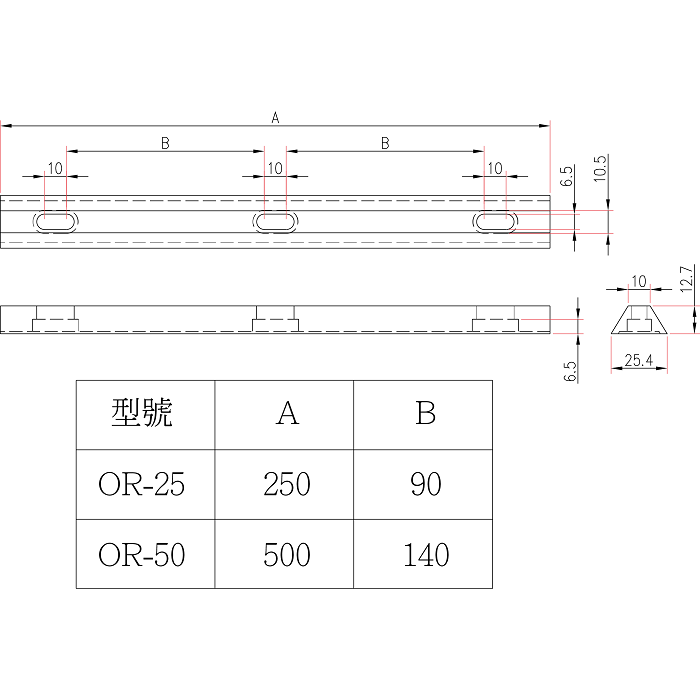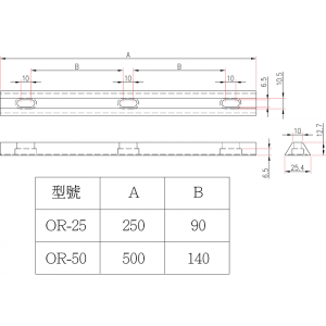 材質:鋁合金黑色陽極處理 可接受訂製其他長度 滑軌型號 規格 OR25 250mm OR50 500mm 滑塊型號 規格與說明 CR01L 大型滑塊 CR01M 中型滑塊 CR01S 小型滑塊 CR01T 可調式滑塊 行程10mm
