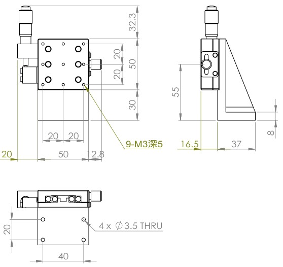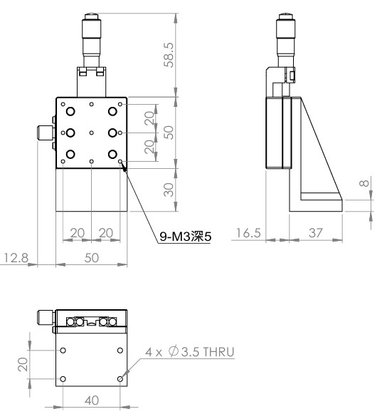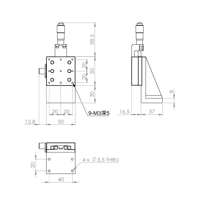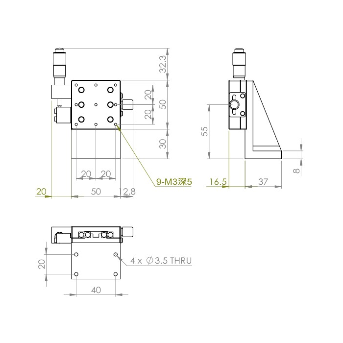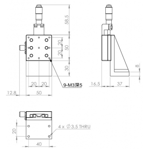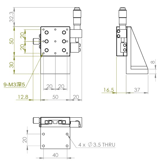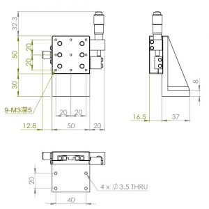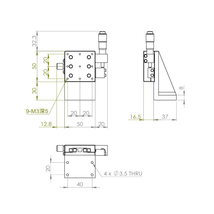 垂直升降,防墜設計 材質:鋁合金黑色陽極處理 檯面尺寸:50 x 50mm 行程:13 mm 驅動方式:分厘卡頭 讀取精度:0.01 mm 偏移量:10 µm 荷重:2 kgf 重量:0.22 kg 選配:-P:高精度分厘卡頭(0.25mm per round) 型號: STV50AC 分厘卡頭位在中心 STV50AL 分厘卡頭位在左側 STV50AR 分厘卡頭位在右側