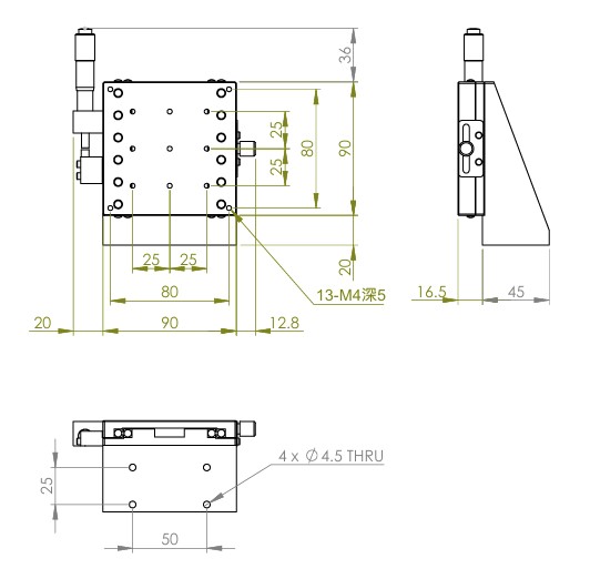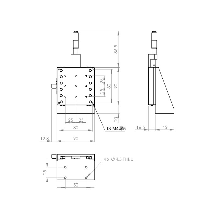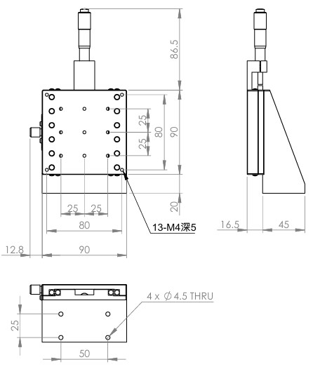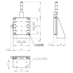 垂直升降,防墜設計 材質:鋁合金黑色陽極處理 檯面尺寸:90 x 90 mm 行程:25 mm 驅動方式:分厘卡頭 讀取精度:0.01 mm 偏移量:10 µm 荷重:6 kgf 重量:0.88 kg 型號: STV90AC 分厘卡頭位在中心 STV80AL 分厘卡頭位在左側 STV80AR 分厘卡頭位在右側