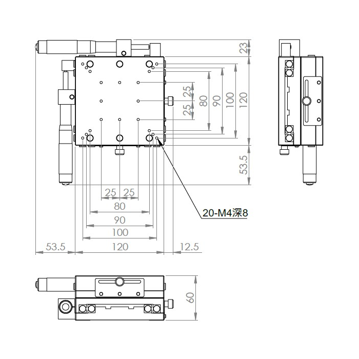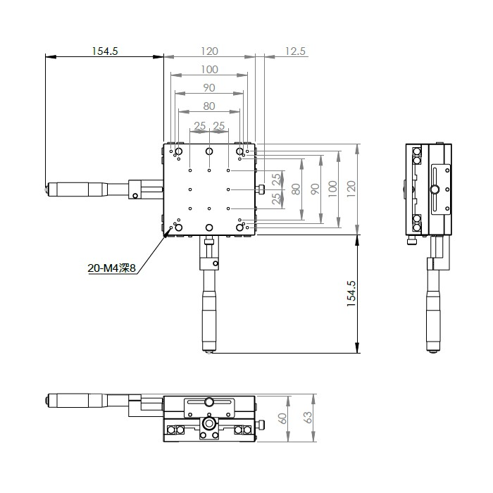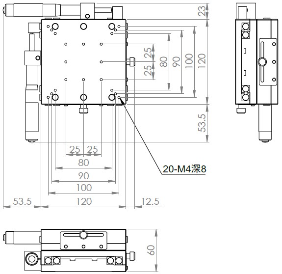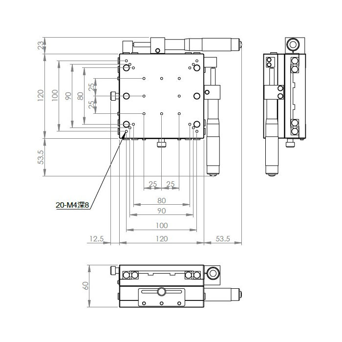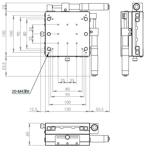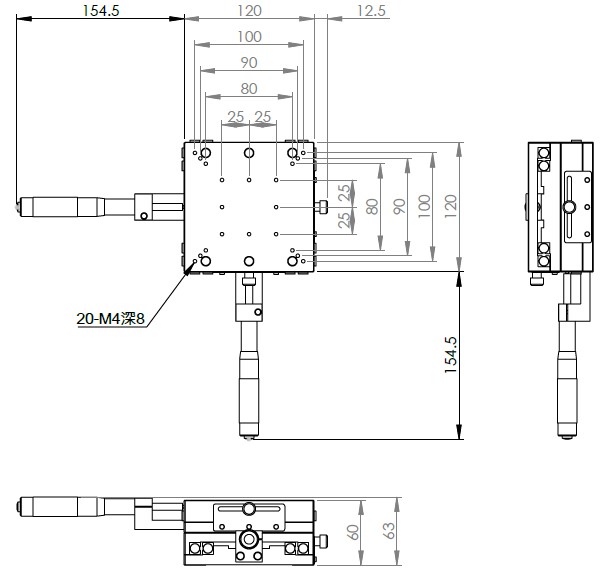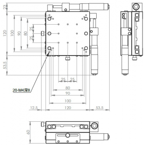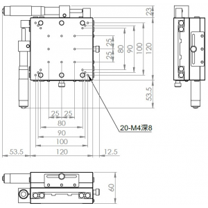 材質:鋁合金黑色陽極處理 檯面尺寸:120 x 120 mm 厚度:60 mm 行程:50 mm 驅動方式:分厘卡頭 讀取精度:0.01mm 平行度:0.1mm 荷重:20 kgf 重量:3.04 kg 型號: ST2120AC 分厘卡頭位在中心 ST2120AL 分厘卡頭位在左側 ST2120AR 分厘卡頭位在右側