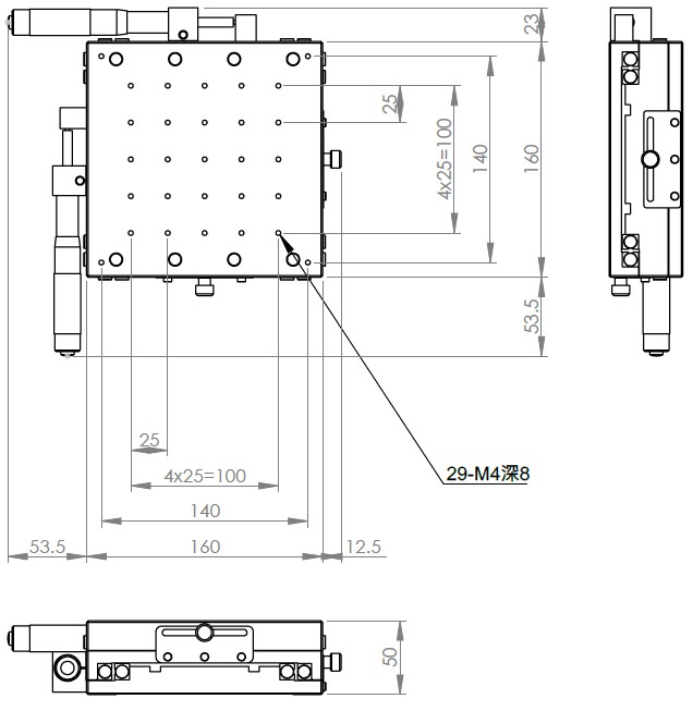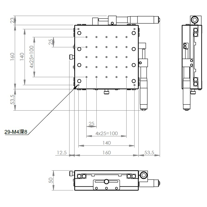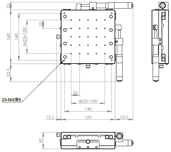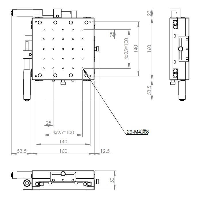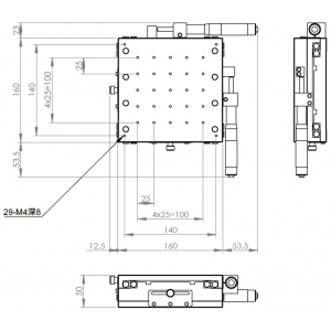 XY軸一體型設計 材質:鋁合金黑色陽極處理 檯面尺寸:160 x 160 mm 厚度:50 mm 行程:50 mm 驅動方式:分厘卡頭 讀取精度:0.01mm 平行度:0.1mm 荷重:40 kgf 重量:4.3 kg 型號: ST2160ALI 分厘卡頭位在左側 ST2160ARI 分厘卡頭位在右側