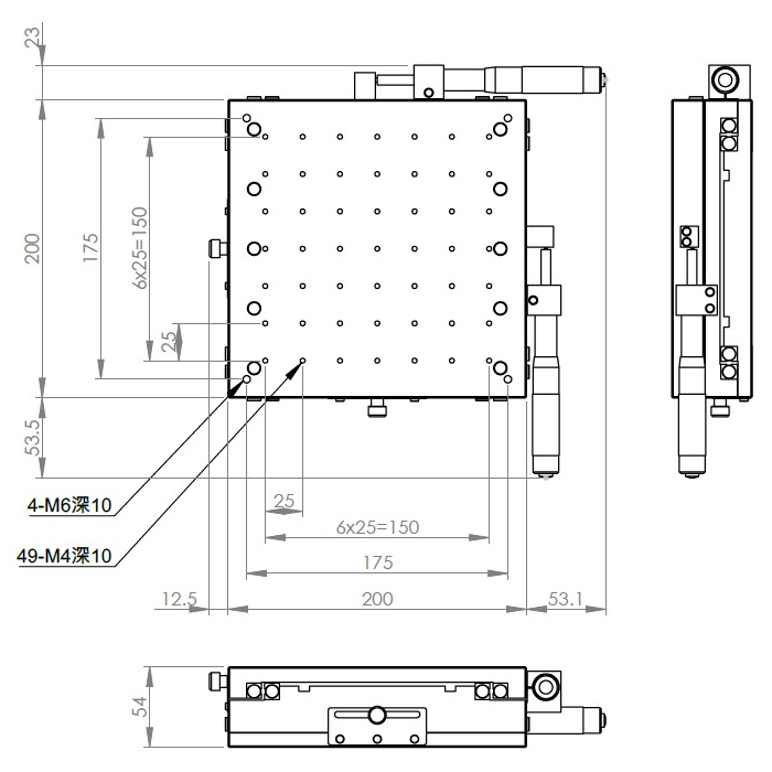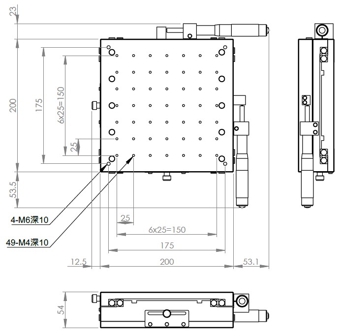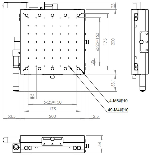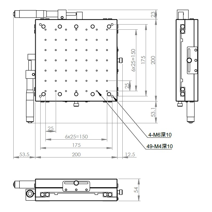 XY軸一體型設計 材質:鋁合金黑色陽極處理 檯面尺寸:200 x 200 mm 厚度:54 mm 行程:50 mm 驅動方式:分厘卡頭 讀取精度:0.01mm 平行度:0.1mm 荷重:40 kgf 重量:6.52 kg 型號: ST2200ALI 分厘卡頭位在左側 ST2200ARI 分厘卡頭位在右側