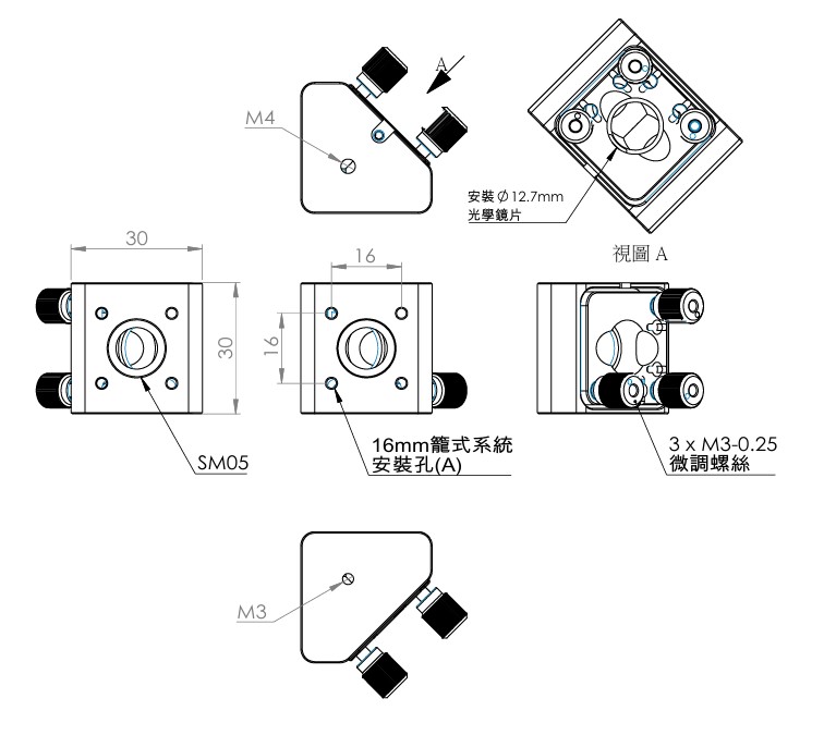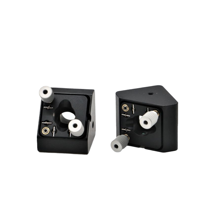 直角光學調整架用於安裝直徑12.7 mm圓形反射鏡,它的入射和出射端都帶有公制M3、英制#4-40螺紋孔或Ø4 mm通孔,用於安裝籠桿,從而可以集成到16 mm籠式系統,調整架還具有SM05內螺紋,可與SM05螺紋的鏡筒相容。
