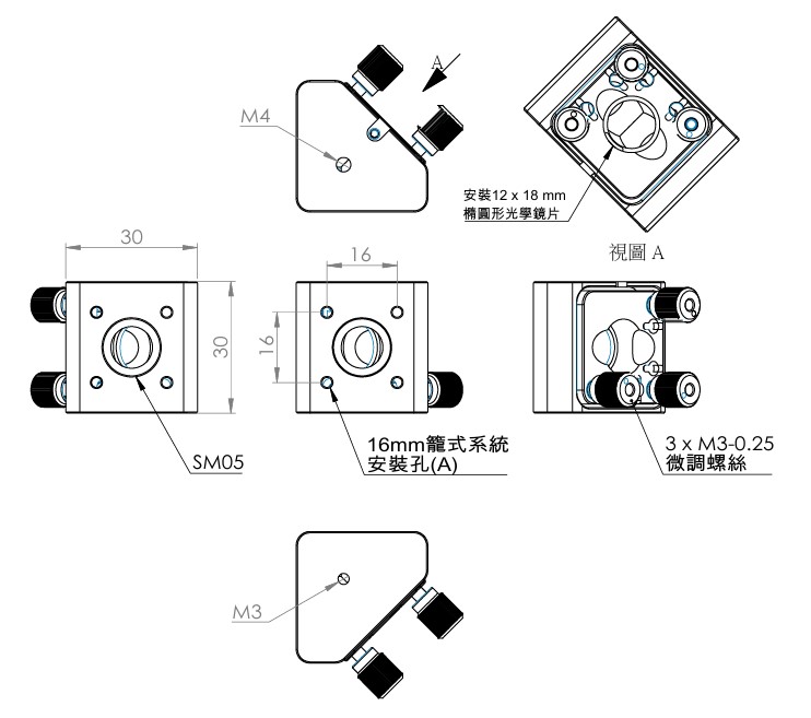 16 mm同軸系統直角反射鏡架適用於45°安裝尺寸12x18mm的橢圓形反射鏡,橢圓形鏡片相較於圓形鏡片在45度角入射時有較大的通光口徑。
