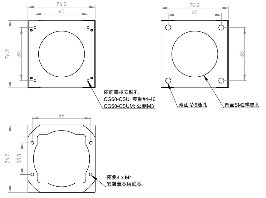 | CG60-CSC2 | 立方體蓋板,帶SM2螺紋,英制4-40螺紋孔 |